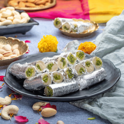 - Rich fusion cake with the traditional flavors of cashew (kaju) and pistachio (pista)